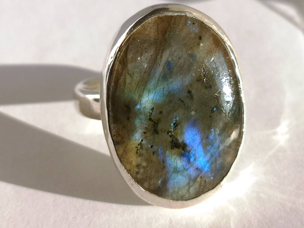 Bague en argent orné d'une gemme ovale cabochon serti clos .