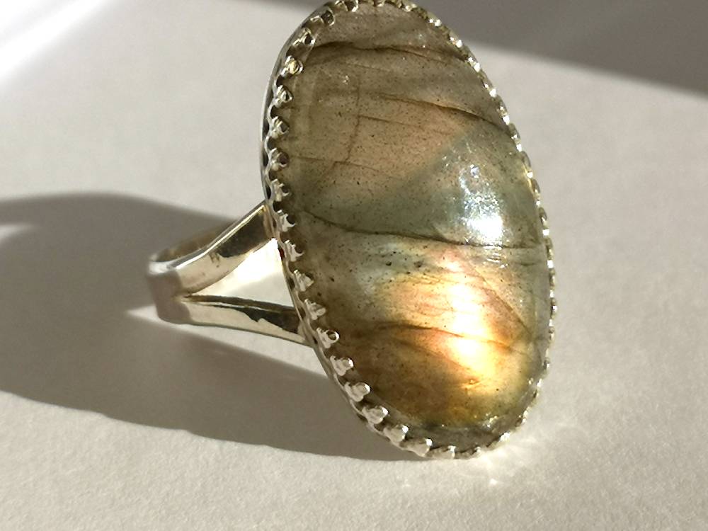 Bague en argent ornée d'une gemme cabochon facettée serti couronne.